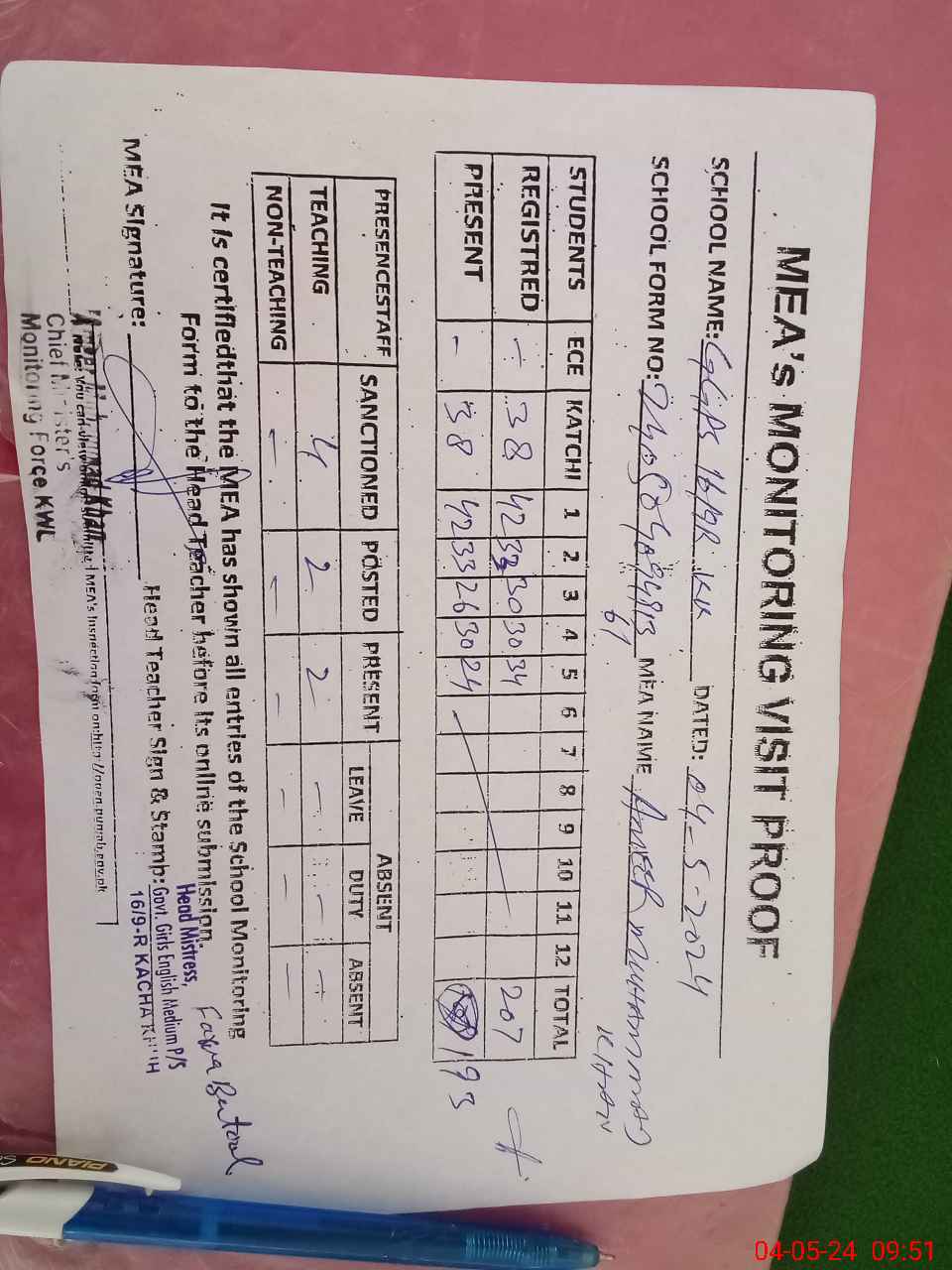 | Attendance Register | Head Teacher | MEA with School | Visit Proof |