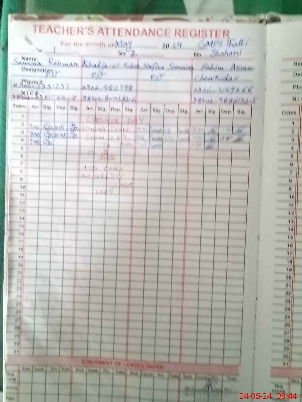 | CNIC | Full Name | Designation | R/C | Absence During Last Calender Month |