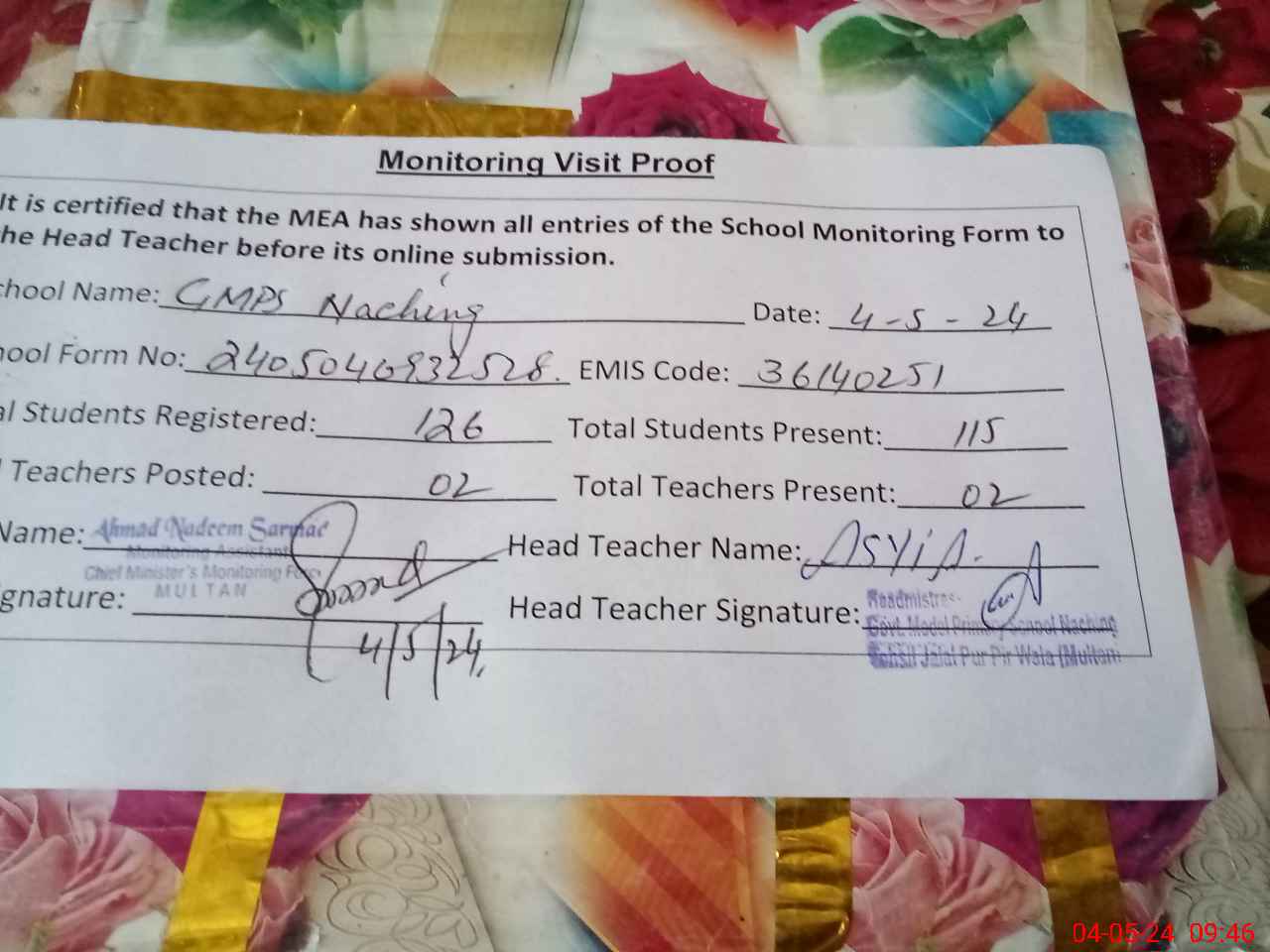 | Attendance Register | Head Teacher | MEA with School | Visit Proof |
