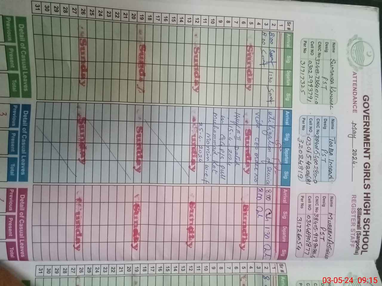 | CNIC | Full Name | Designation | R/C | Absence During Last Calender Month |