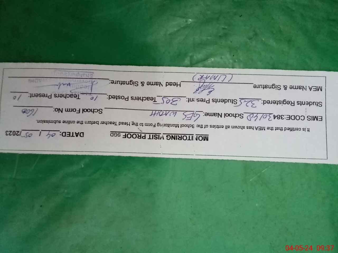| Attendance Register | Head Teacher | MEA with School | Visit Proof |