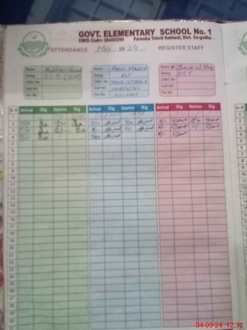 | CNIC | Full Name | Designation | R/C | Absence During Last Calender Month |