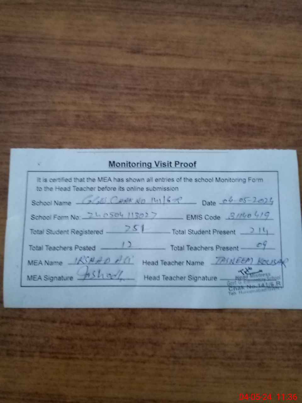 | Attendance Register | Head Teacher | MEA with School | Visit Proof |