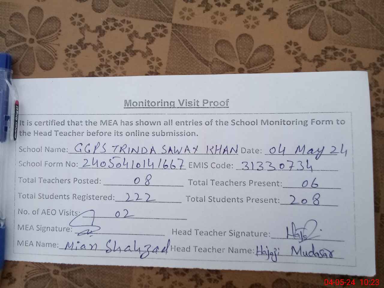 | Attendance Register | Head Teacher | MEA with School | Visit Proof |
