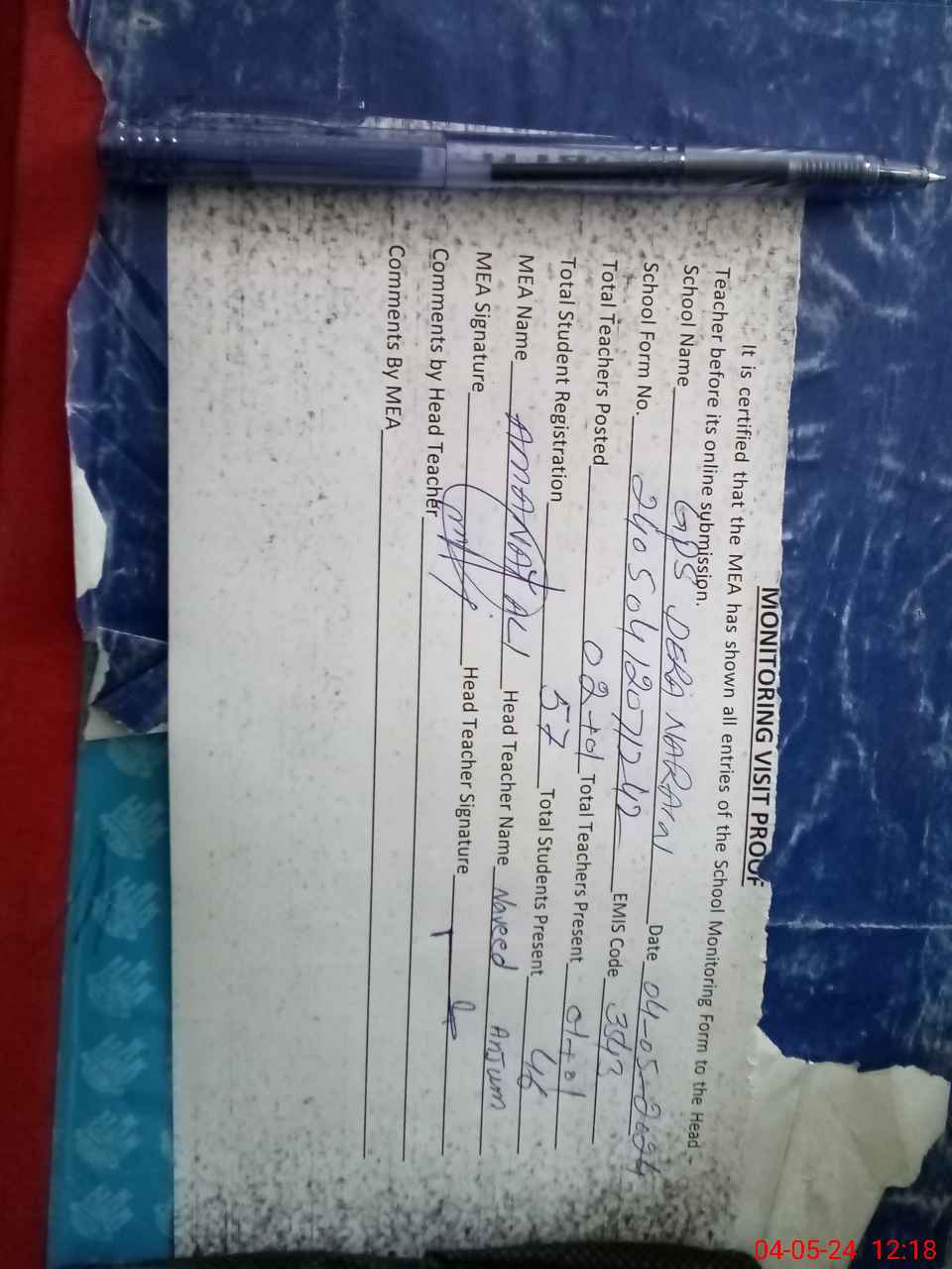 | Attendance Register | Head Teacher | MEA with School | Visit Proof |