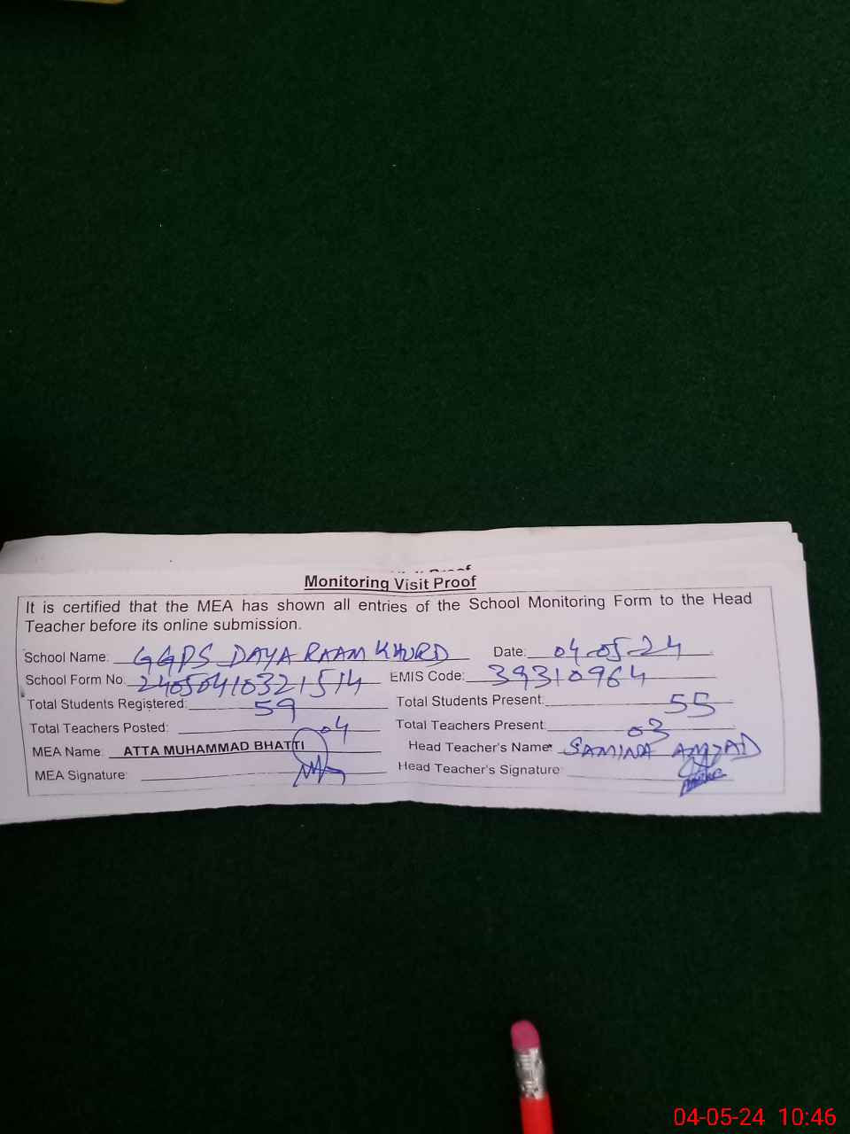 | Certified that this School was Inspected by the Undersigned MEA/DMO Today and the Information Stated Above is as Per Record. | |||||