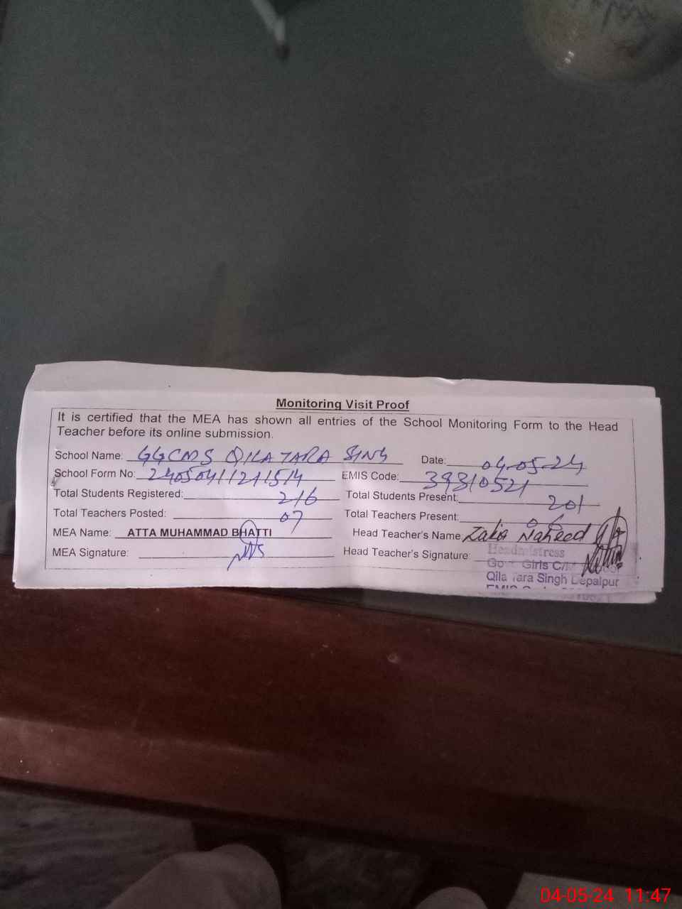 | Attendance Register | Head Teacher | MEA with School | Visit Proof |