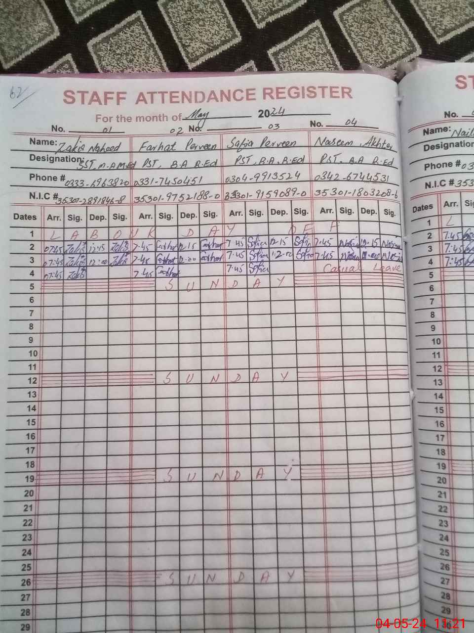 | CNIC | Full Name | Designation | R/C | Absence During Last Calender Month |