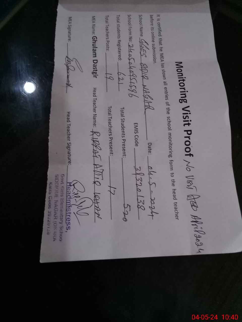 | Attendance Register | Head Teacher | MEA with School | Visit Proof |