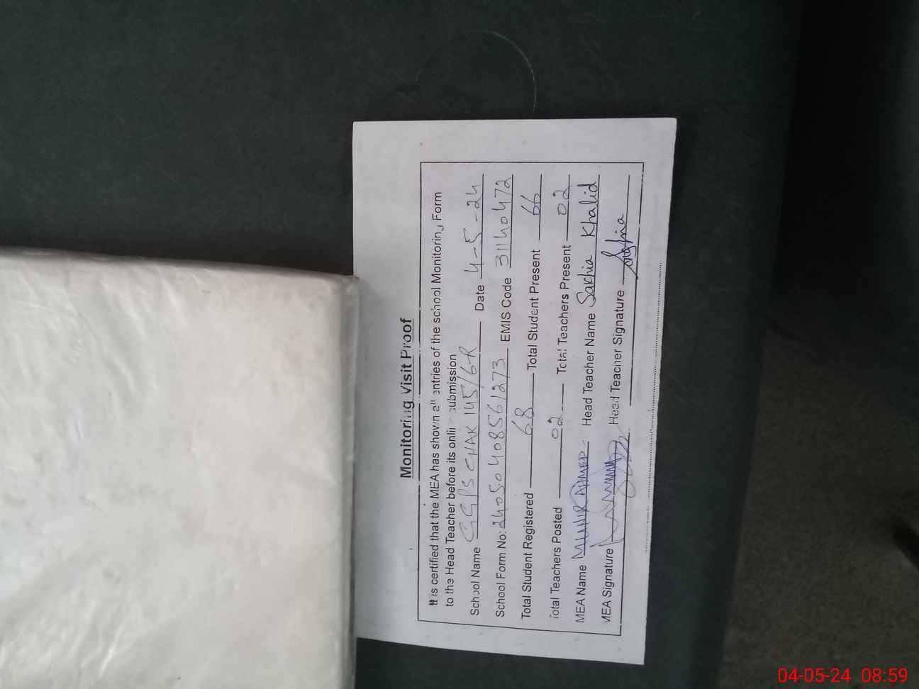 | Attendance Register | Head Teacher | MEA with School | Visit Proof |