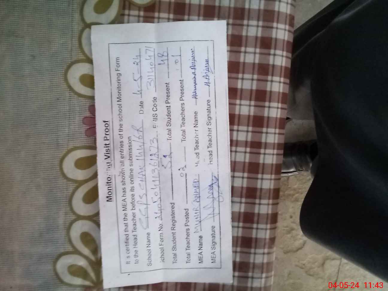 | Attendance Register | Head Teacher | MEA with School | Visit Proof |
