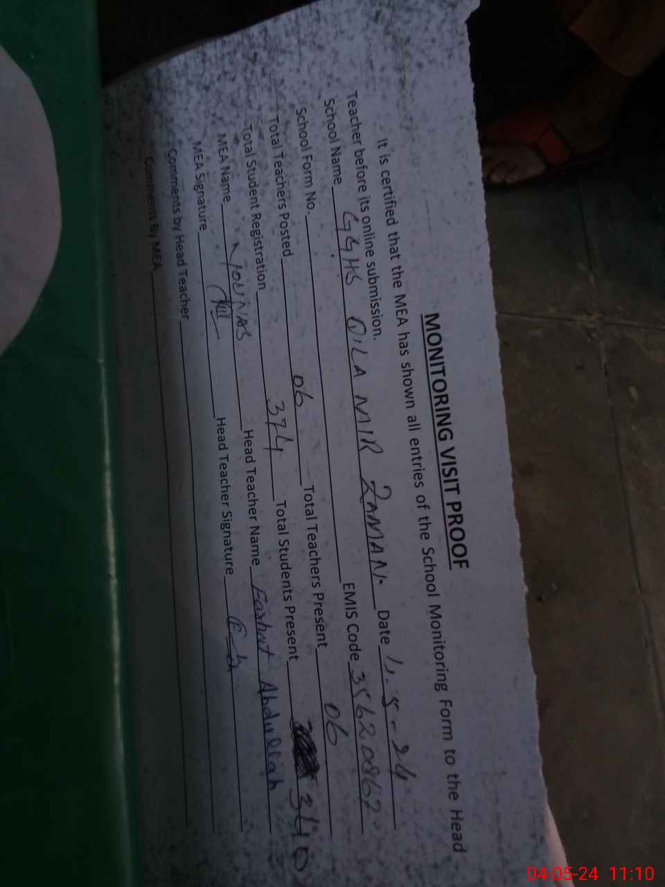 | Attendance Register | Head Teacher | MEA with School | Visit Proof |
