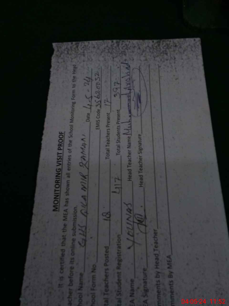 | Attendance Register | Head Teacher | MEA with School | Visit Proof |