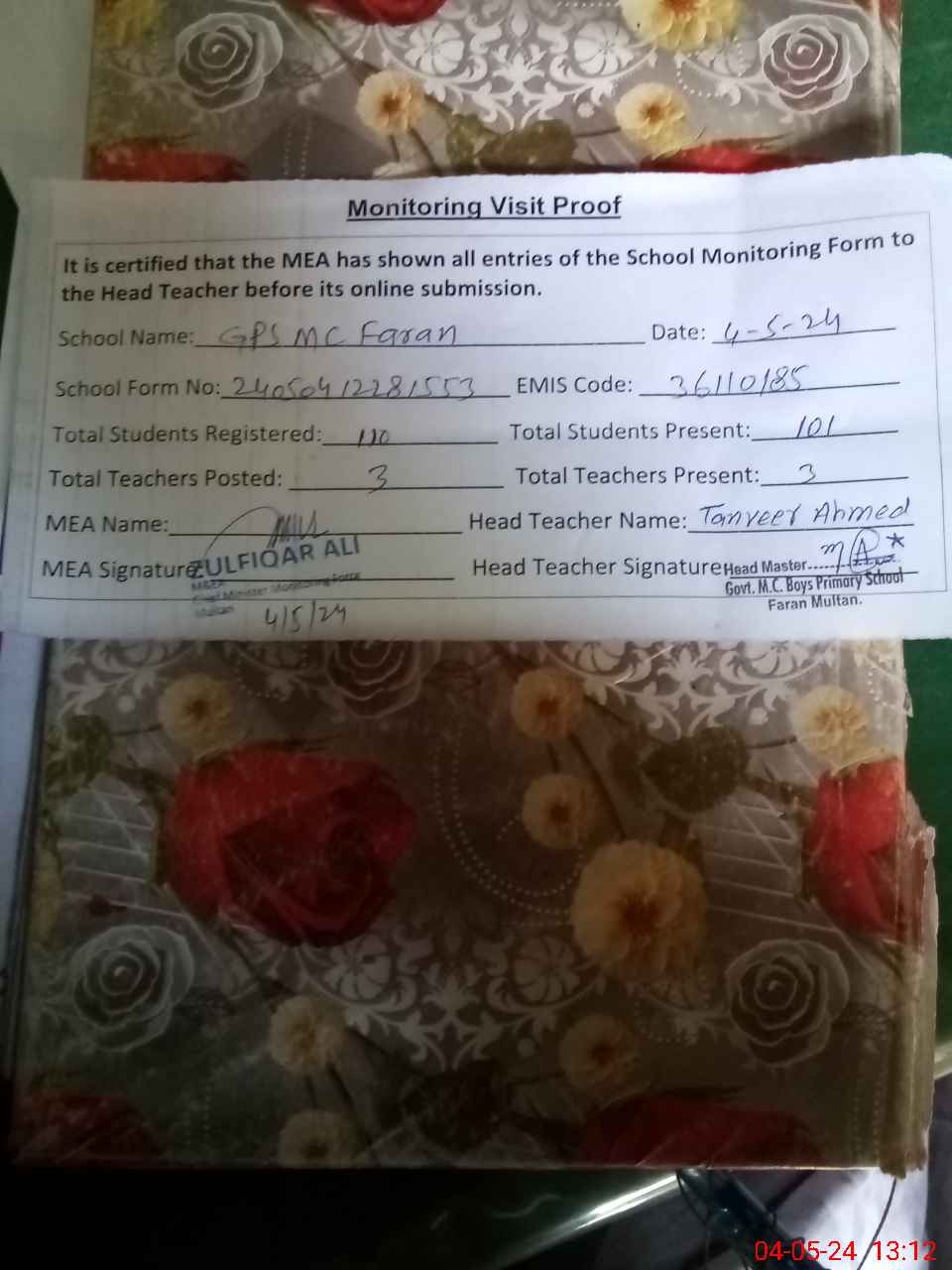 | EMIS Code: 36110185 | Name of School: GPS MC FARAAN NEAR KHONI BURJ MULTAN | |||