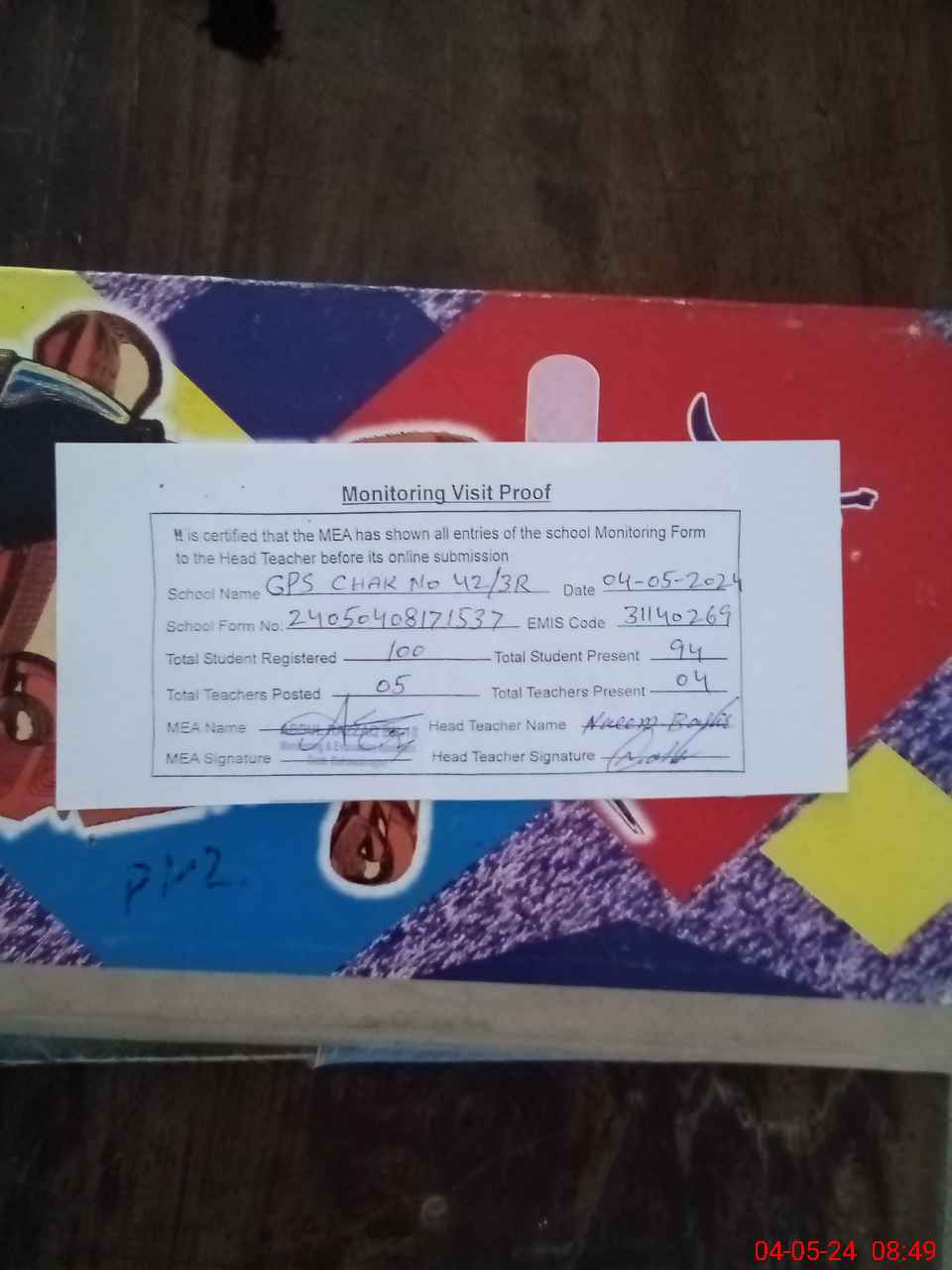 | EMIS Code: 31140269 | Name of School: GPS CHAK NO.42/3-R | |||