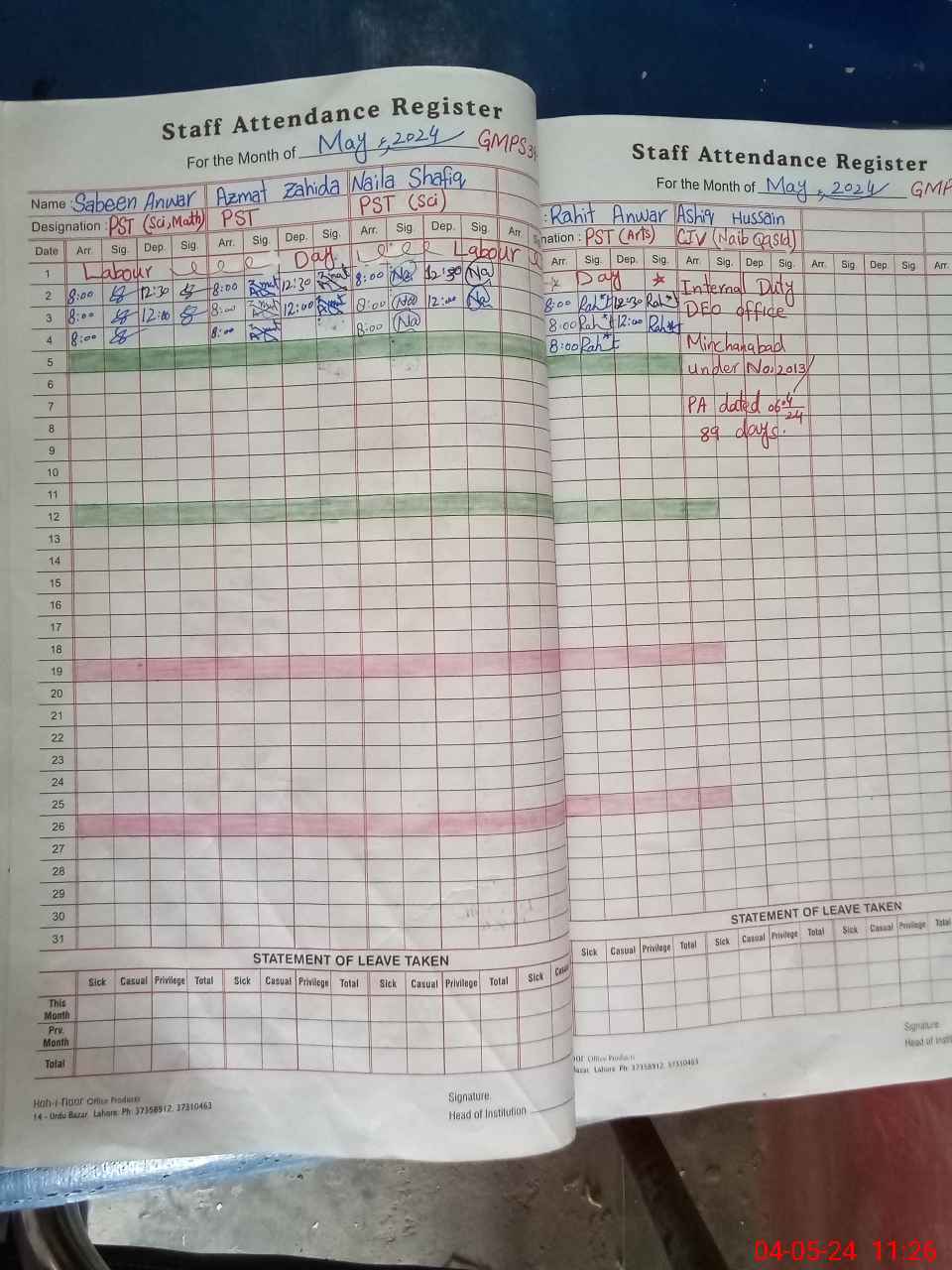 | Leave | Duty | Absent | Maternity | Medical | Ex- Pak |