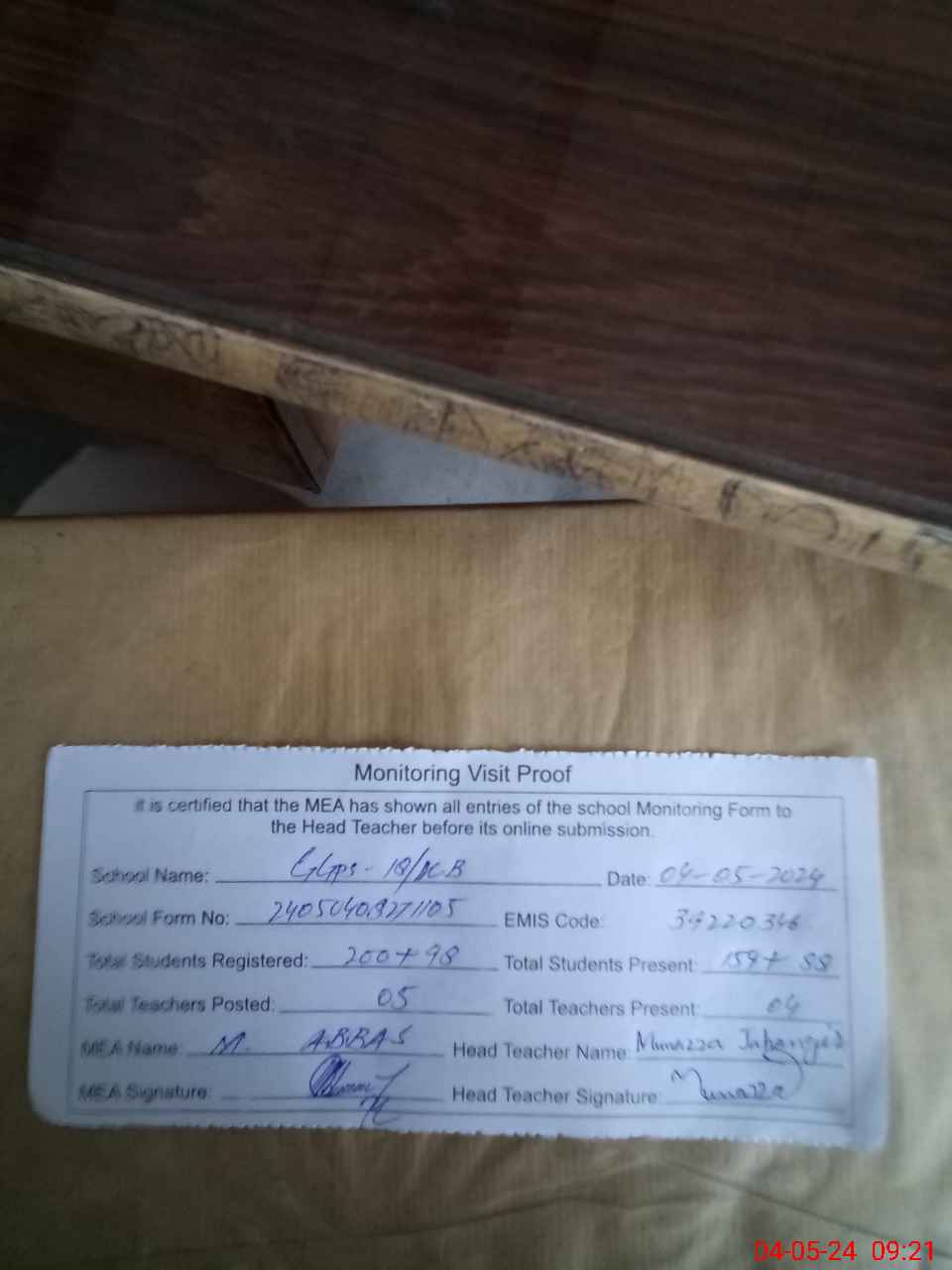 | Attendance Register | Head Teacher | MEA with School | Visit Proof |