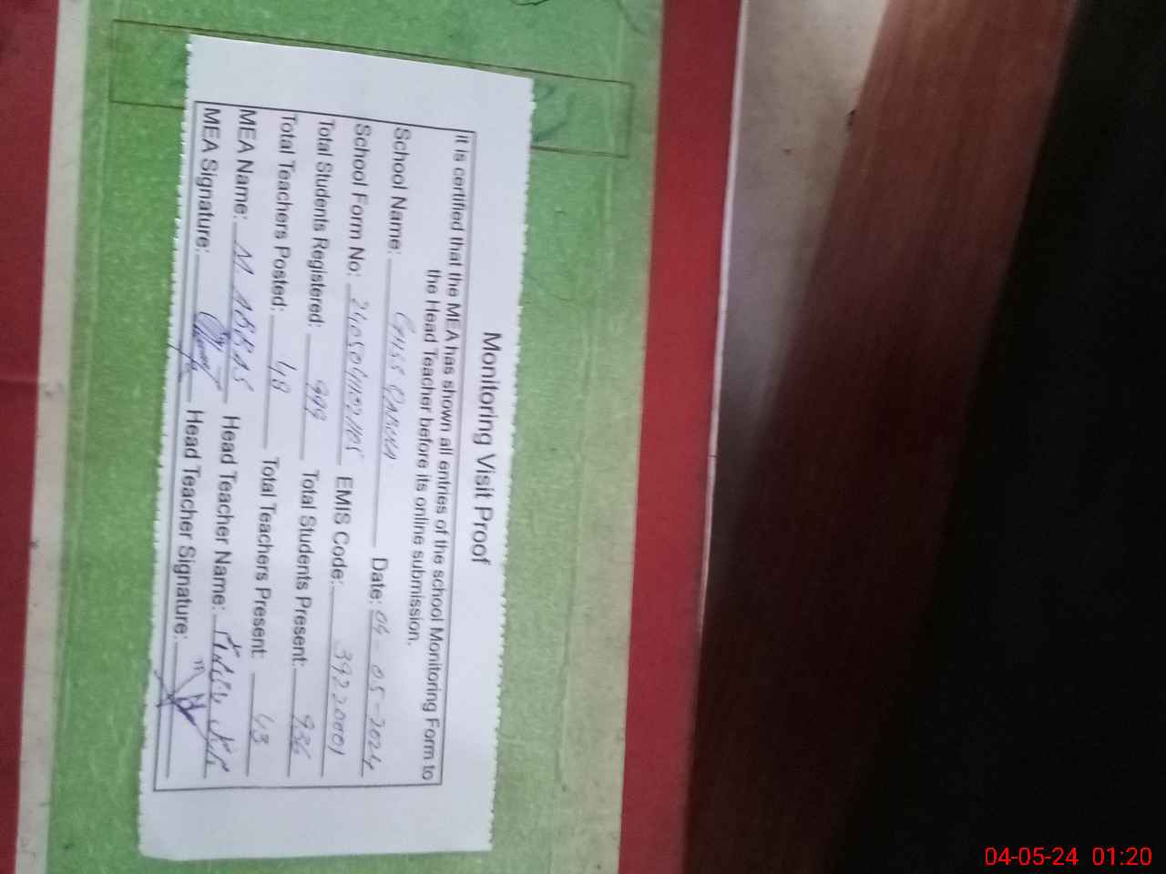 | Attendance Register | Head Teacher | MEA with School | Visit Proof |