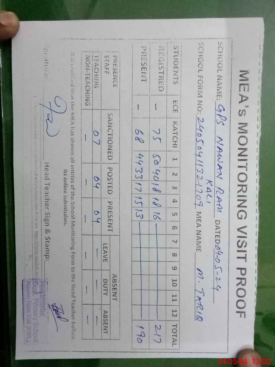 | Attendance Register | Head Teacher | MEA with School | Visit Proof |