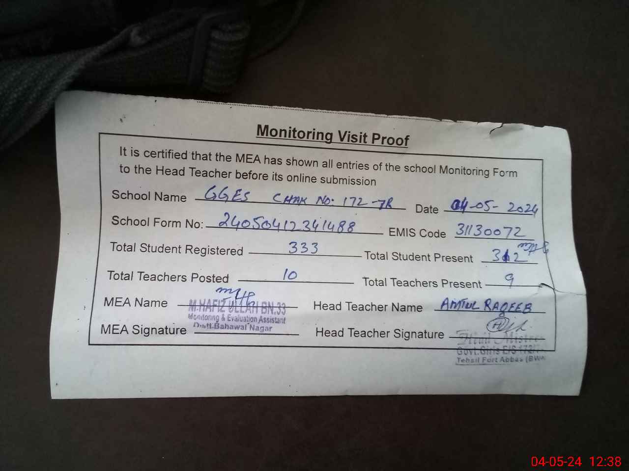 | Attendance Register | Head Teacher | MEA with School | Visit Proof |