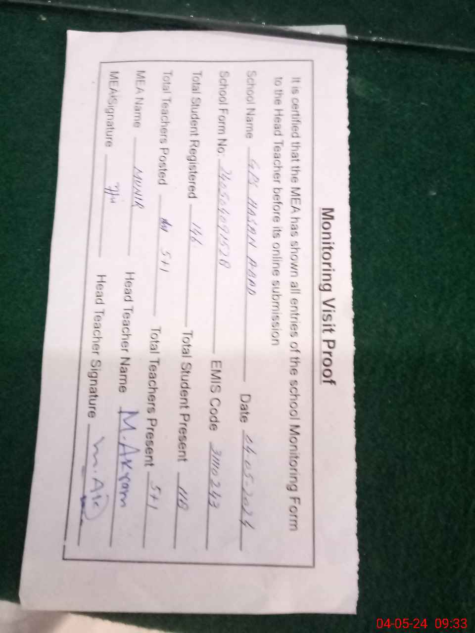 | Attendance Register | Head Teacher | MEA with School | Visit Proof |