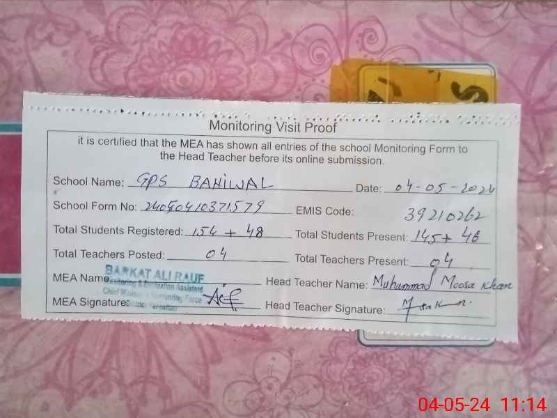 | EMIS Code: 39210262 | Name of School: GPS BAHIWAL | |||
