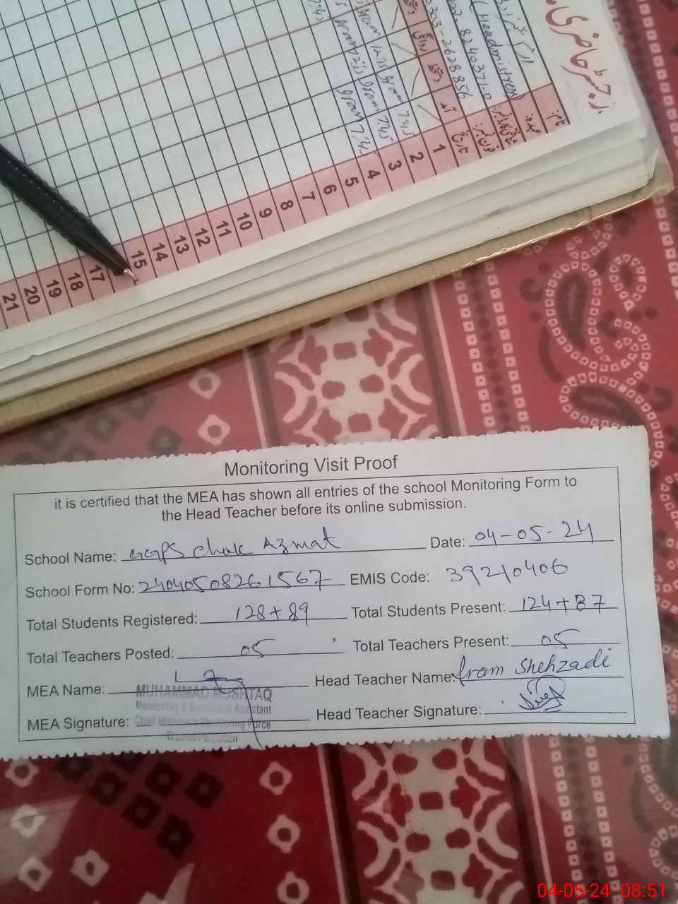 | Attendance Register | Head Teacher | MEA with School | Visit Proof |