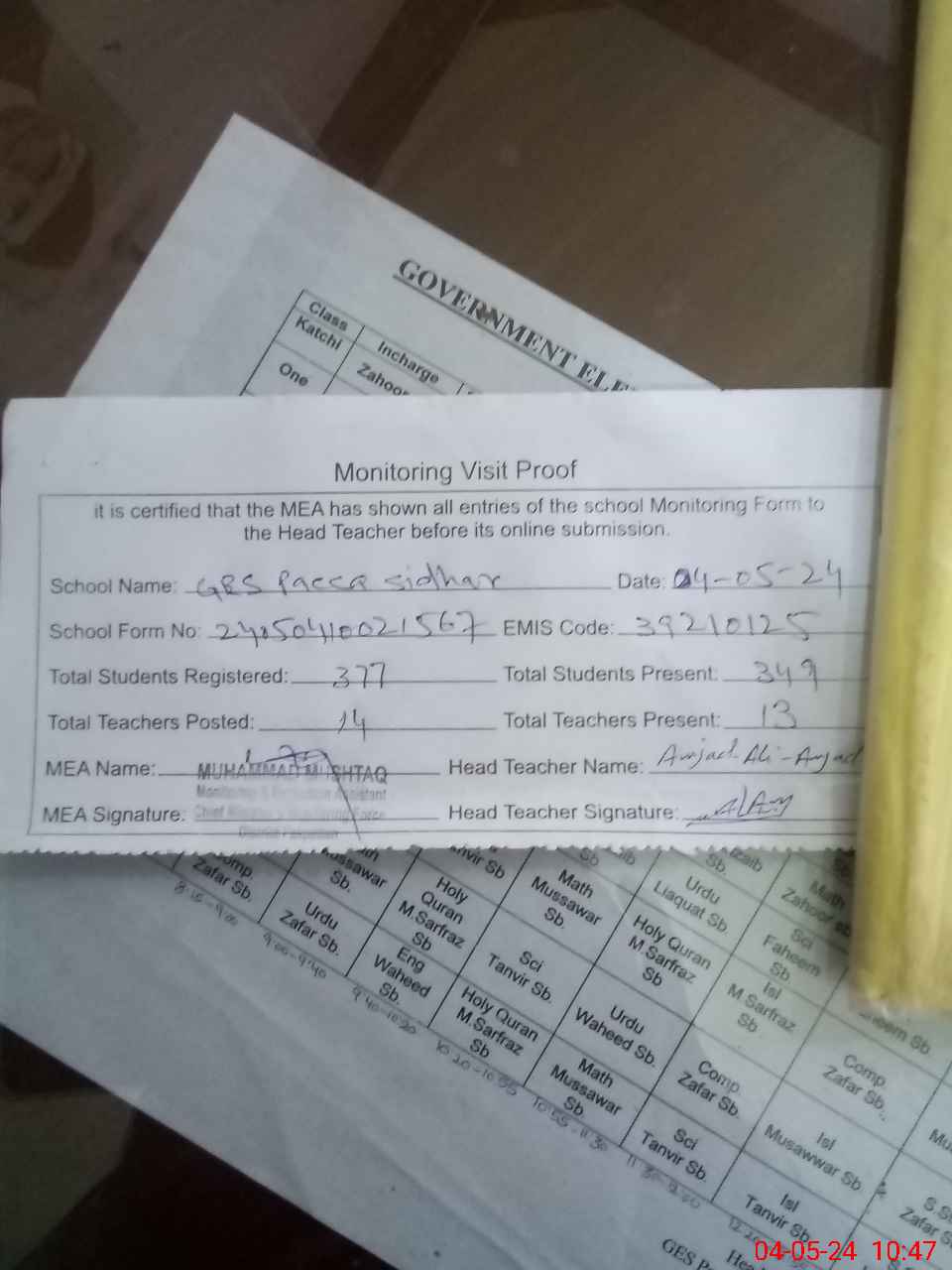 | Attendance Register | Head Teacher | MEA with School | Visit Proof |