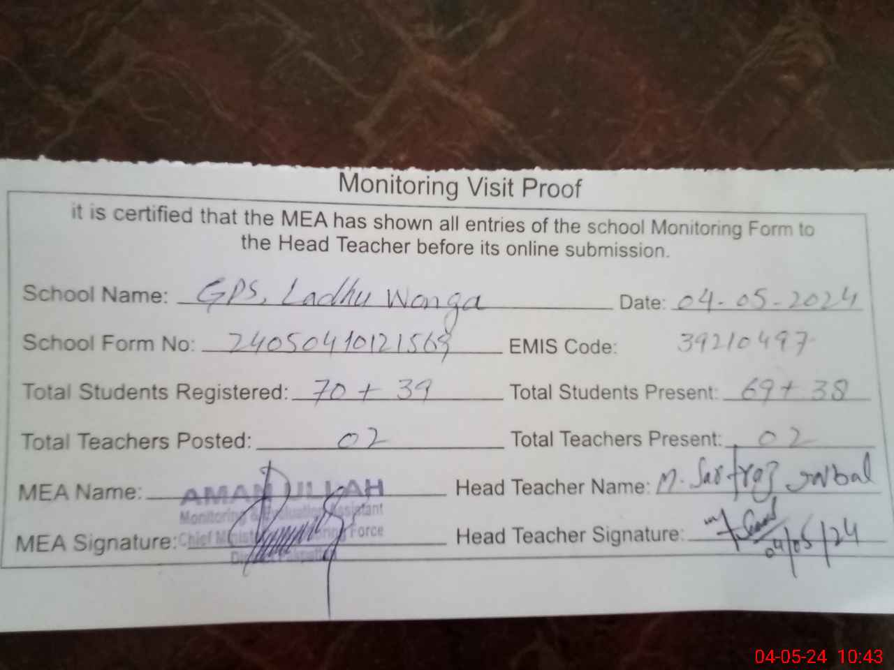| EMIS Code: 39210497 | Name of School: GPS LADHU WANGA | |||