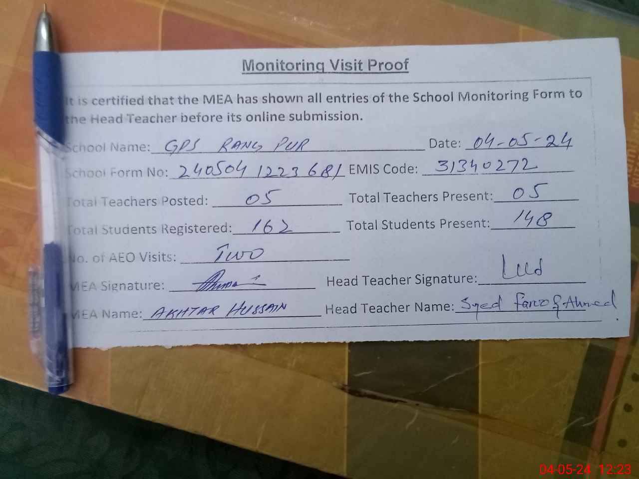 | Attendance Register | Head Teacher | MEA with School | Visit Proof |