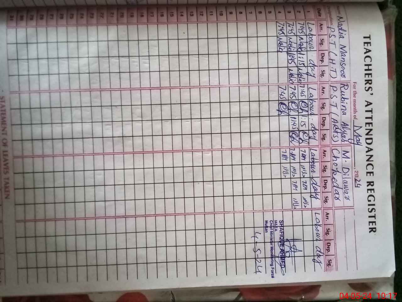 | CNIC | Full Name | Designation | R/C | Absence During Last Calender Month |