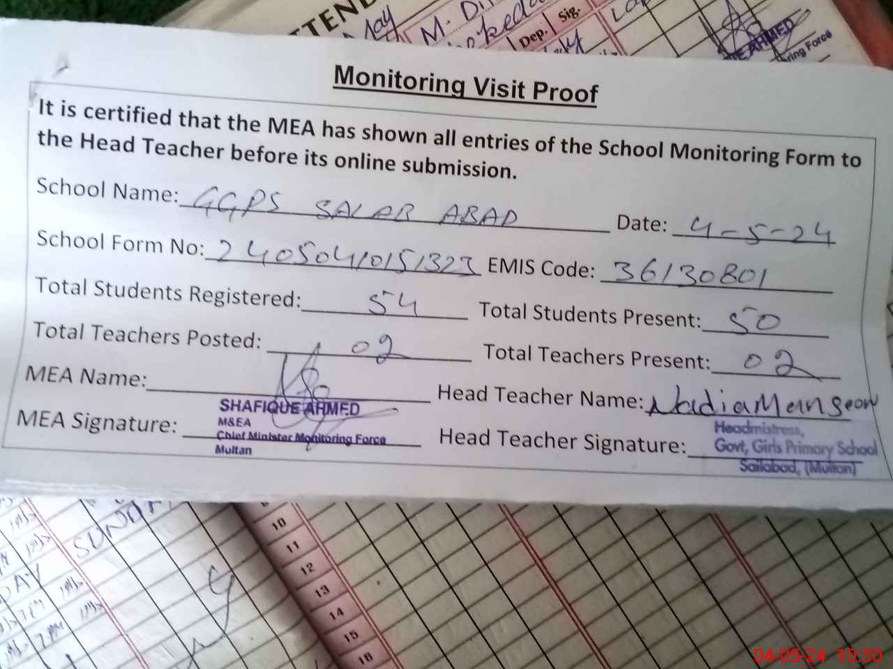 | Attendance Register | Head Teacher | MEA with School | Visit Proof |