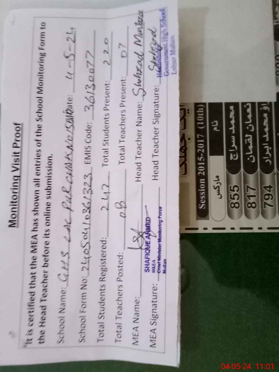 | Certified that this School was Inspected by the Undersigned MEA/DMO Today and the Information Stated Above is as Per Record. | |||||