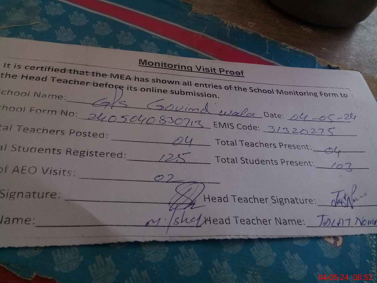 | EMIS Code: 31320275 | Name of School: GPS MOADIB GOVIND WALA | |||