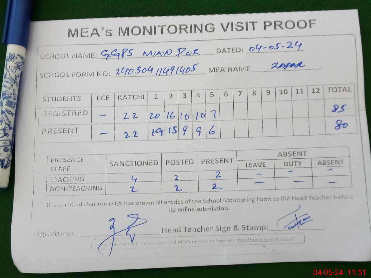 | Attendance Register | Head Teacher | MEA with School | Visit Proof |