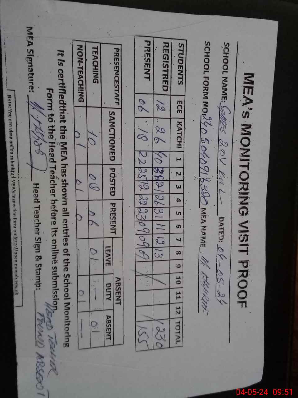 | Attendance Register | Head Teacher | MEA with School | Visit Proof |