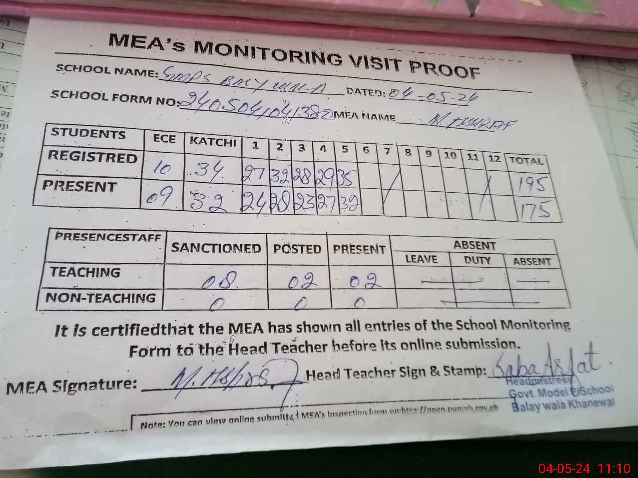 | Attendance Register | Head Teacher | MEA with School | Visit Proof |