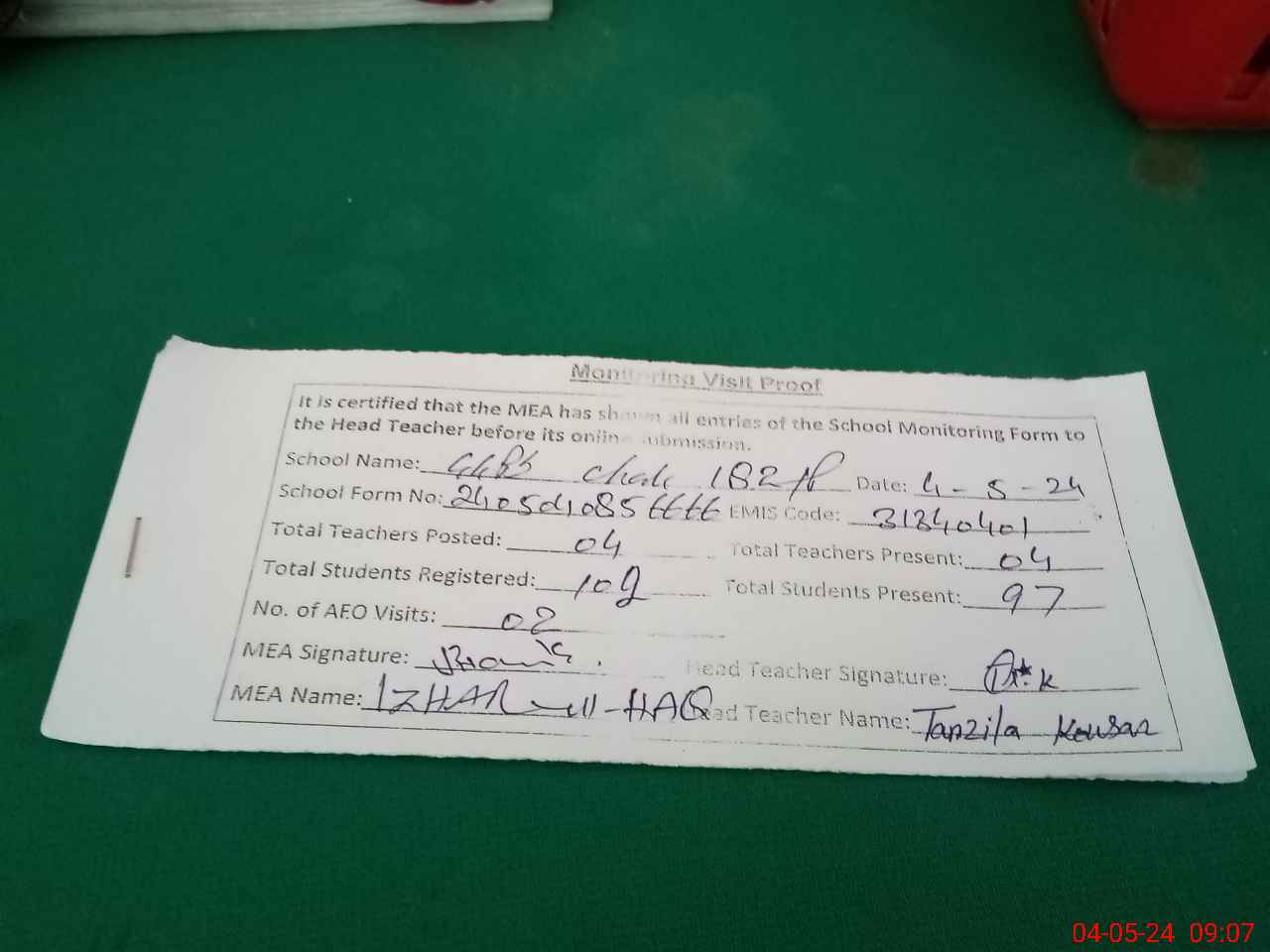 | Attendance Register | Head Teacher | MEA with School | Visit Proof |