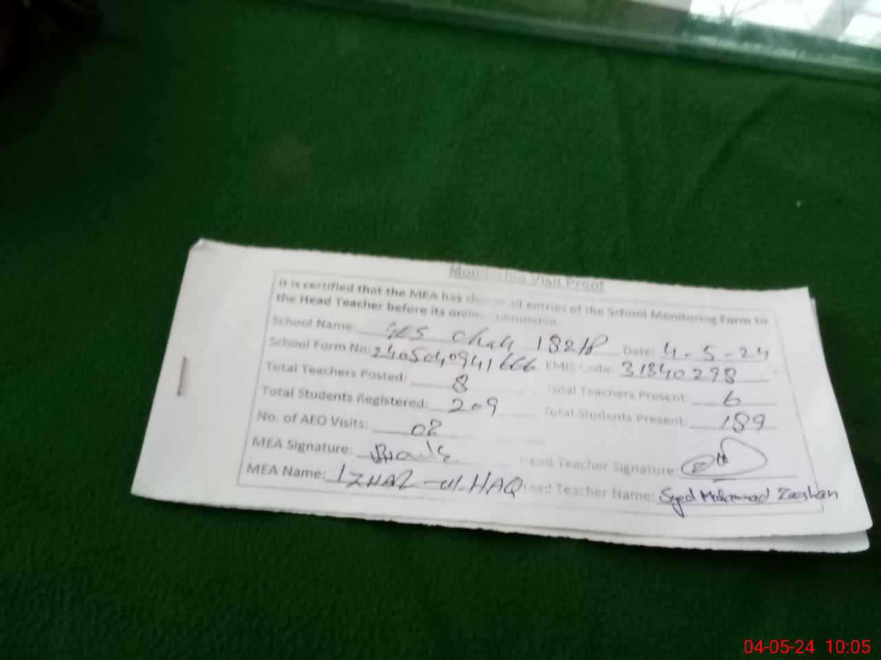 | Monitoring Date: 04-05-2024 | Start Time: 04-05-2024 09:16 AM | End Time: 04-05-2024 10:05 AM | Name of MEA: Mu**** Iz**** UlHa**** | |