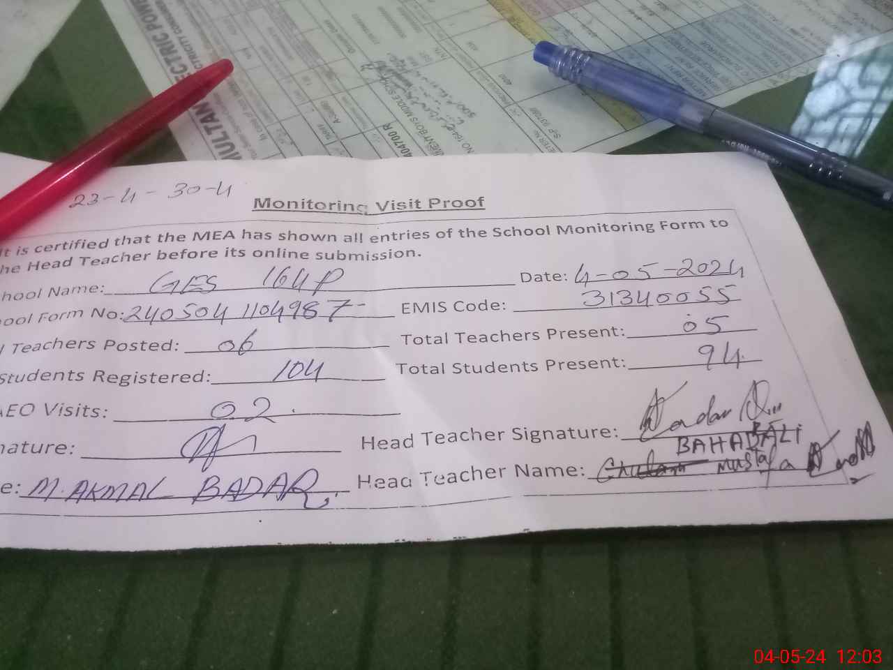 | EMIS Code: 31340055 | Name of School: GES CHAK NO 164/NP | |||