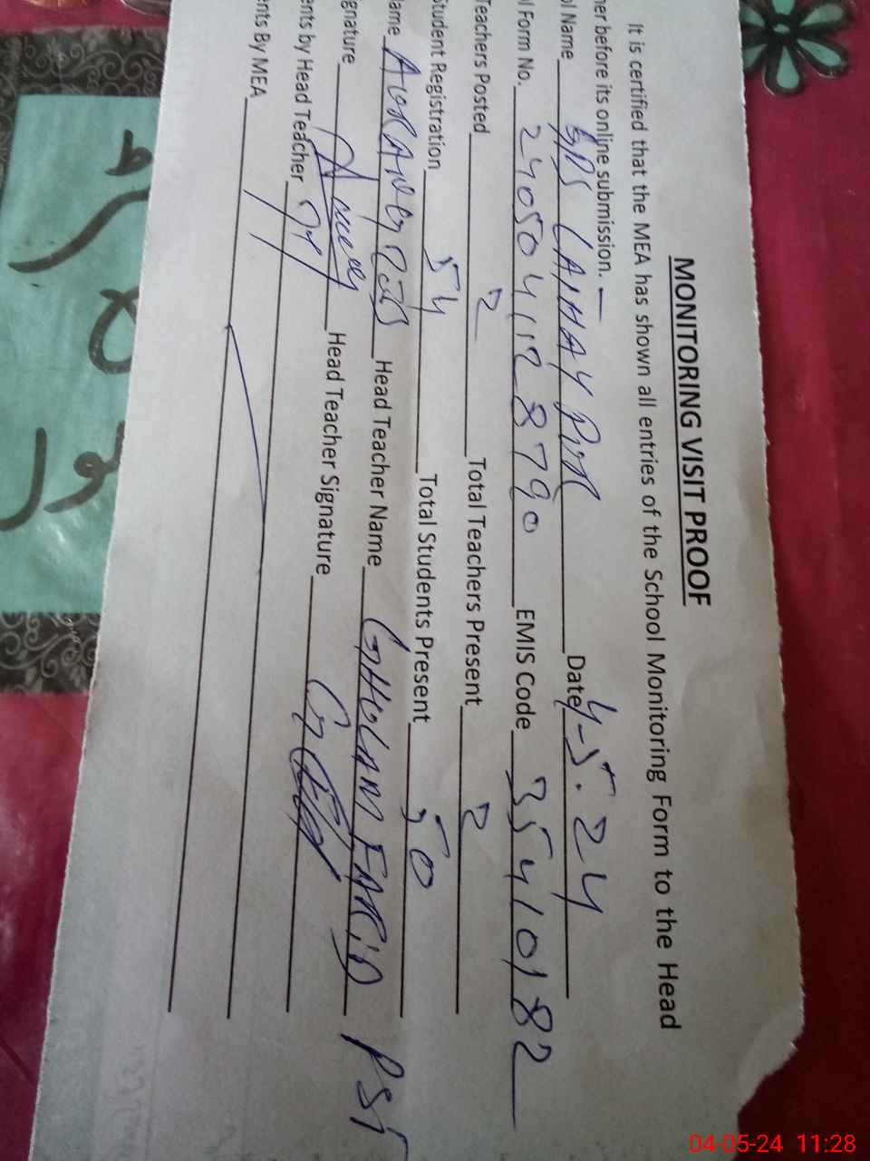 | Attendance Register | Head Teacher | MEA with School | Visit Proof |