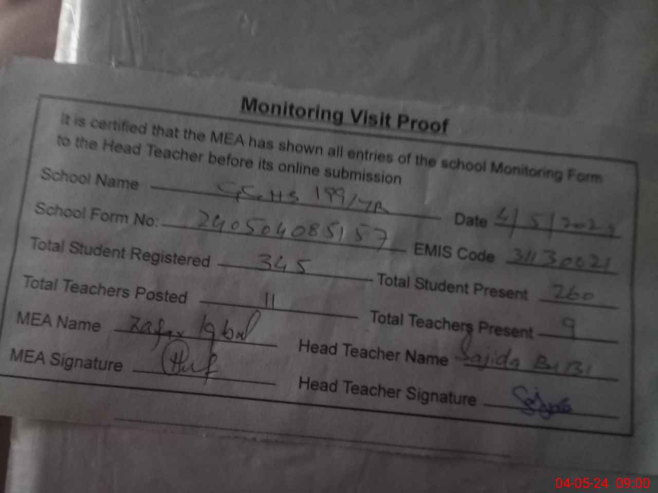 | Monitoring Date: 04-05-2024 | Start Time: 04-05-2024 08:25 AM | End Time: 04-05-2024 09:01 AM | Name of MEA: Za**** Iq**** BN**** | |