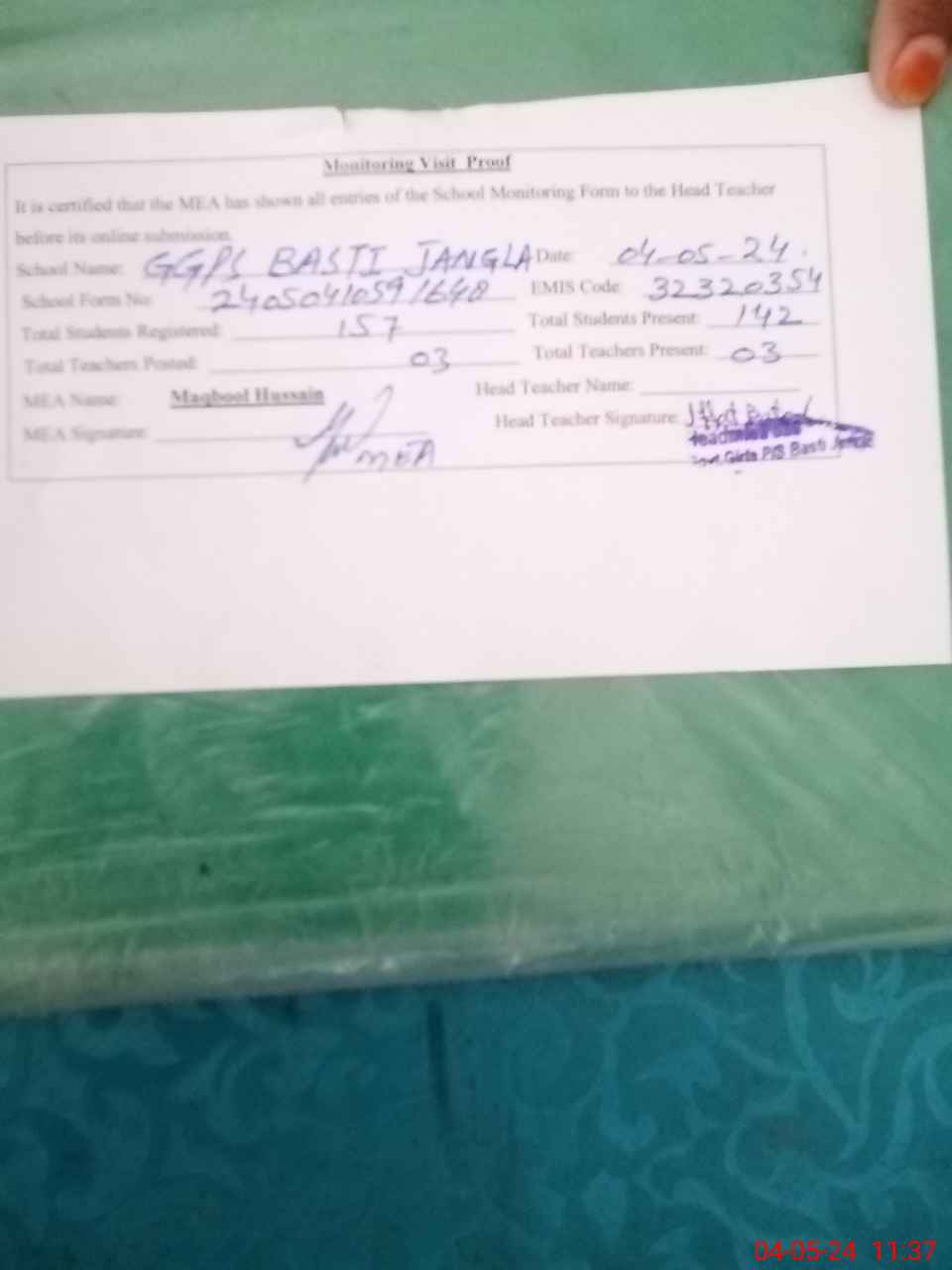| Attendance Register | Head Teacher | MEA with School | Visit Proof |
