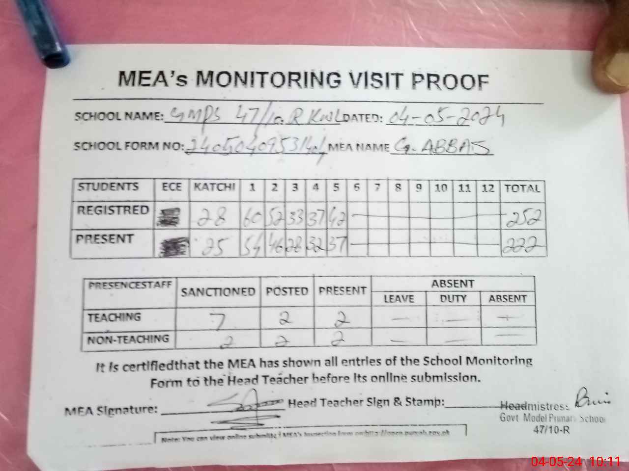 | Attendance Register | Head Teacher | MEA with School | Visit Proof |