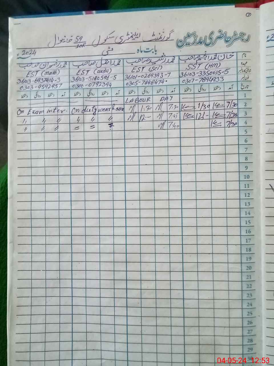 | 36**** | Mu**** Ri**** | 3 | 1 | 0 | 0 | 0 | 0 | 0 | 0 | 0 | 0 | 0 | Exam Duty |