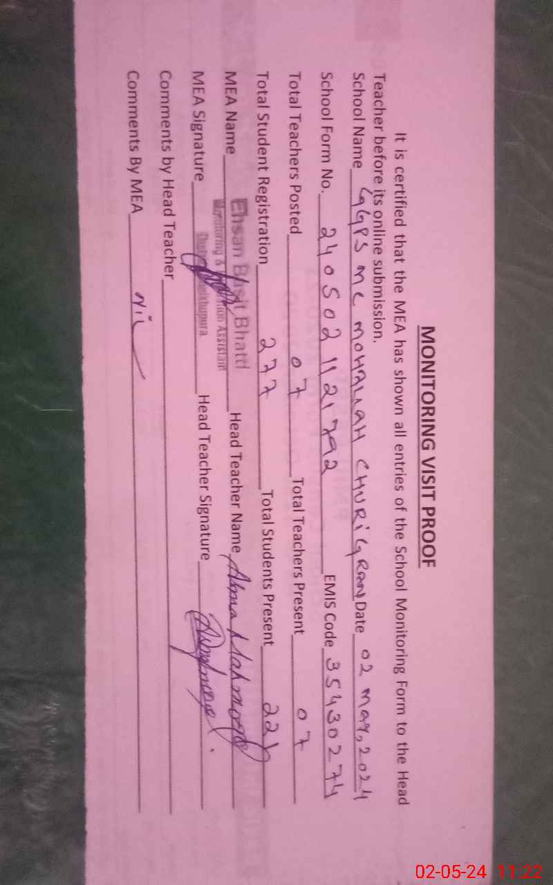 | EMIS Code: 35430274 | Name of School: GGPS MC MOHALLAH CHURIGRAN | |||