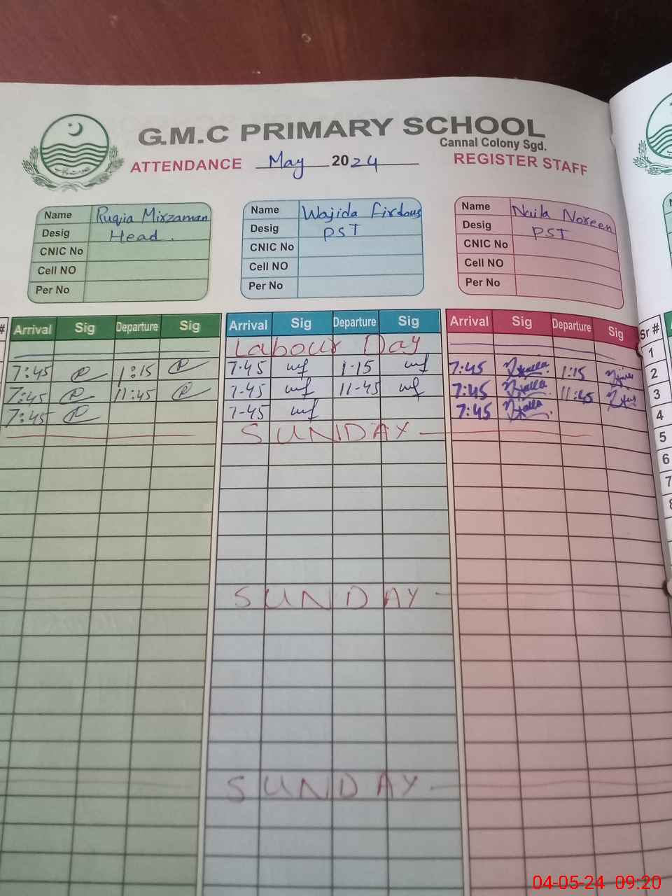 | CNIC | Full Name | Designation | R/C | Absence During Last Calender Month |
