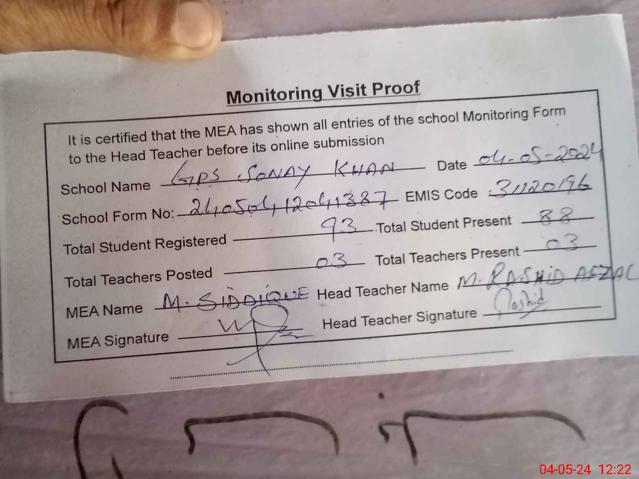 | EMIS Code: 31120196 | Name of School: GPS SONAY KHAN | |||