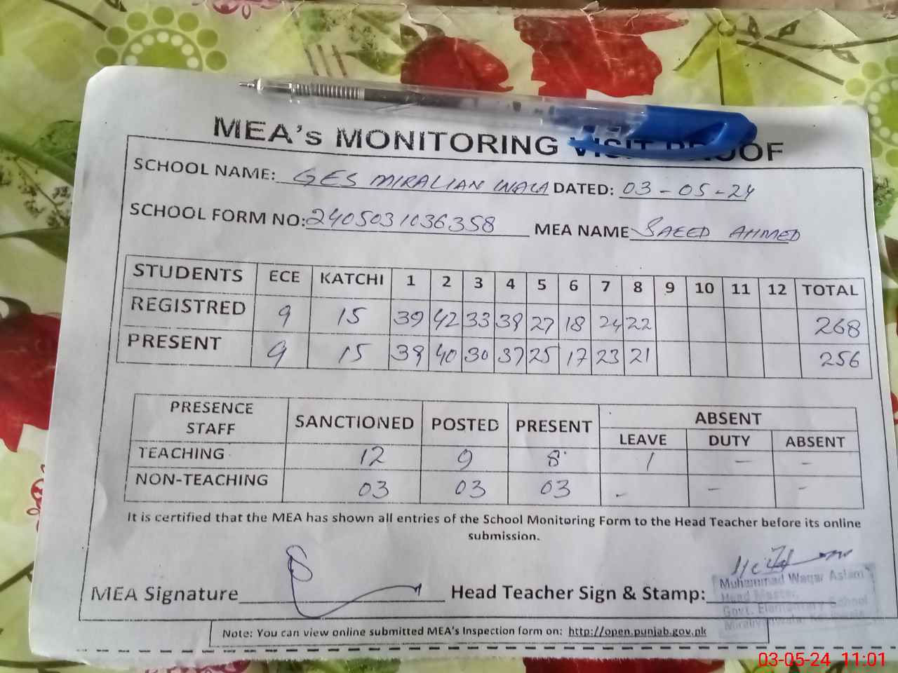 | Attendance Register | Head Teacher | MEA with School | Visit Proof |
