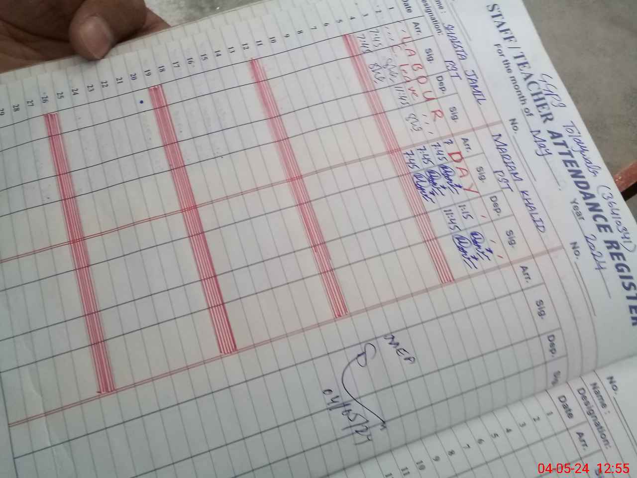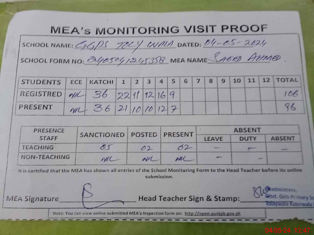 | Attendance Register | Head Teacher | MEA with School | Visit Proof |
